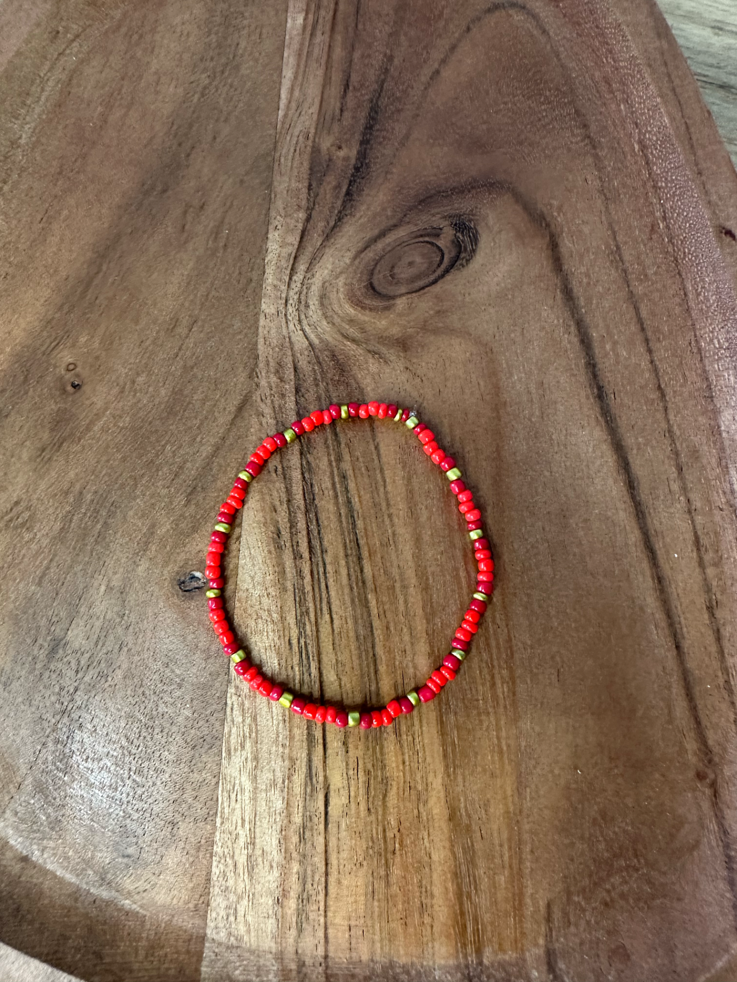Ručně vyrobený náramek z drobných korálků. Z pružné elastické nitě. Laděný do červených barev. Perfektní volba pro ty, kdo mají rádi jednoduchou, ale krásnou bižuterii.
