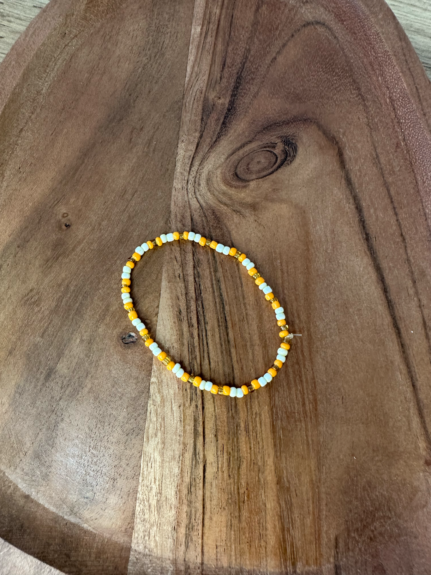 Ručně vyrobený náramek z drobných korálků. Z pružné elastické nitě. Laděný do oranžových barev. Perfektní volba pro ty, kdo mají rádi jednoduchou, ale krásnou bižuterii.