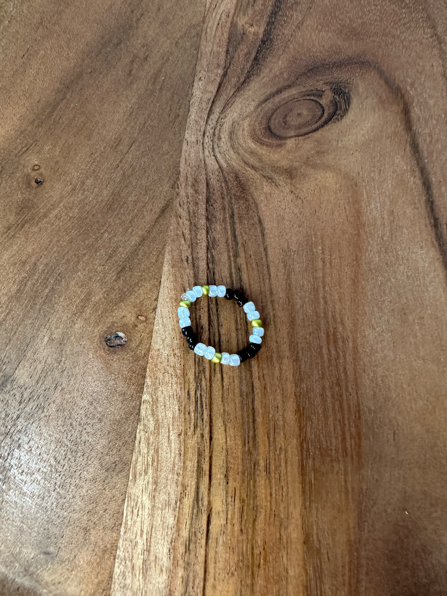 Ručně vyrobený prstýnek z drobných korálků. je krásným doplňkem pro každodenní nošení. Laděný do černobílých barev.