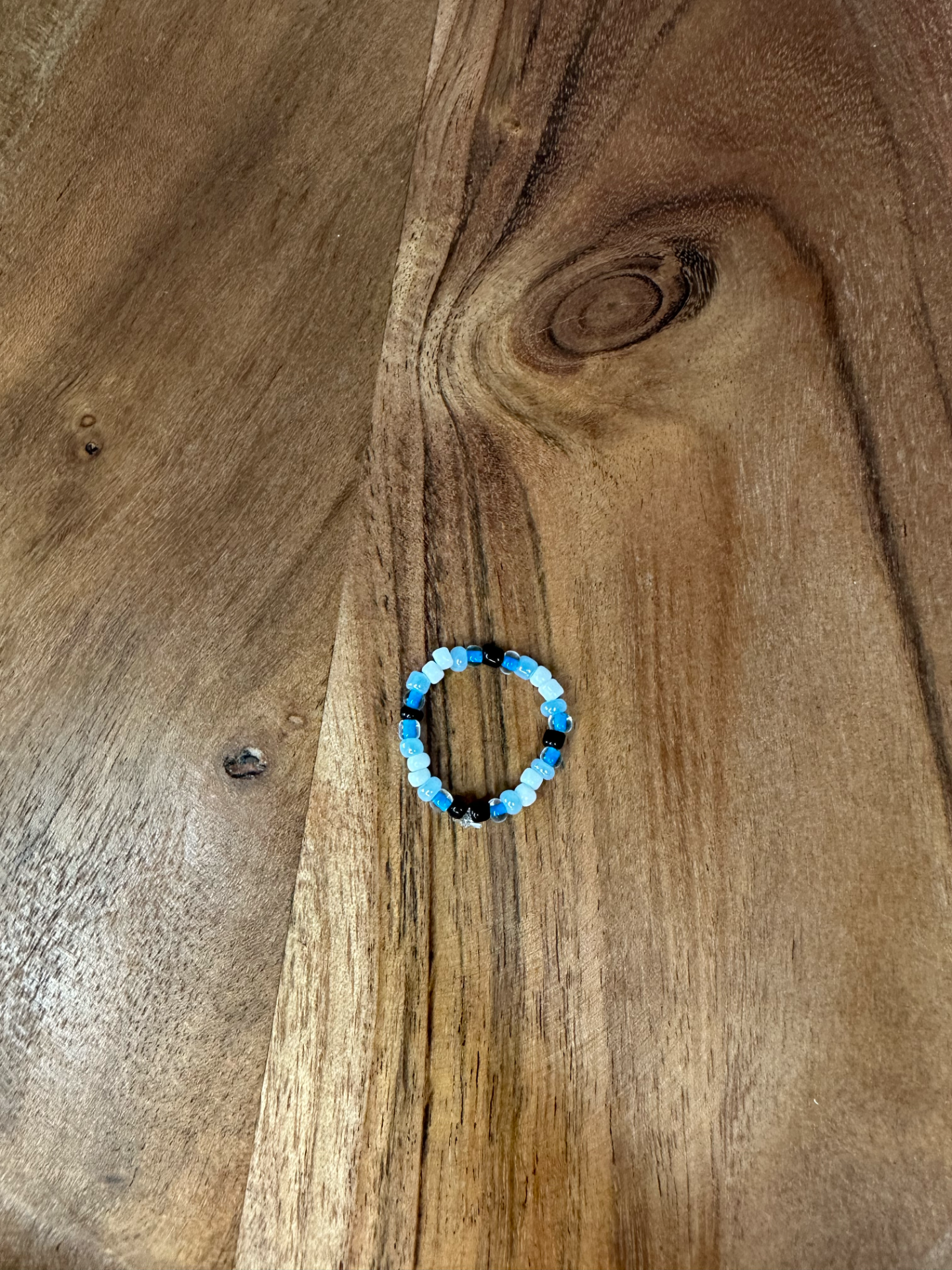 Ručně vyrobený prstýnek z drobných korálků. je krásným doplňkem pro každodenní nošení. Laděný do modrých barev.