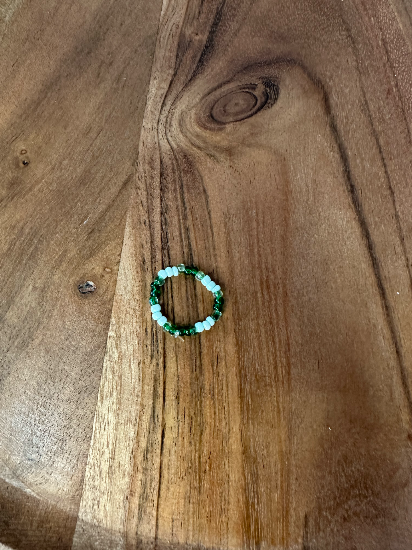 Ručně vyrobený prstýnek z drobných korálků. je krásným doplňkem pro každodenní nošení. Laděný do zelených barev.