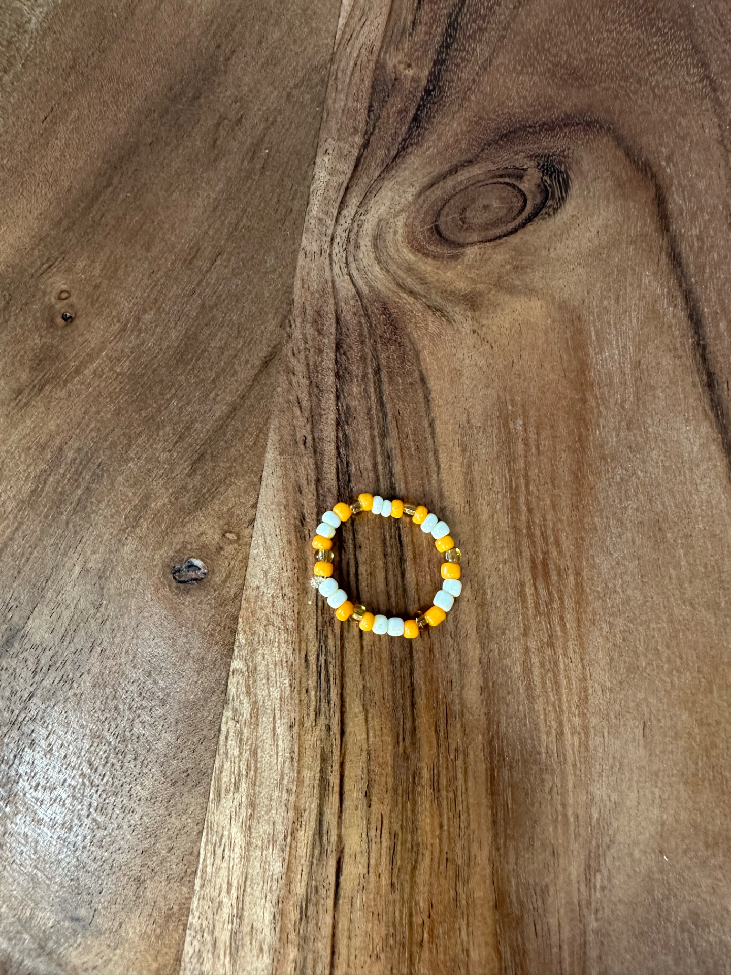 Ručně vyrobený prstýnek z drobných korálků. je krásným doplňkem pro každodenní nošení. Laděný do oranžových barev.