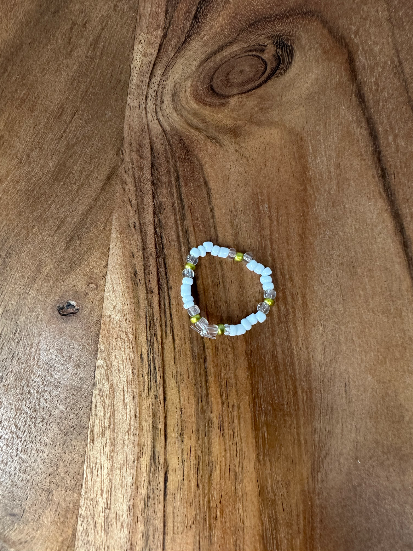 Ručně vyrobený prstýnek z drobných korálků. je krásným doplňkem pro každodenní nošení. Laděný do bílých barev.